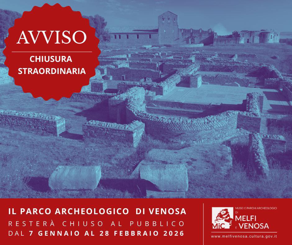 Si informano i gentili visitatori che il 𝗽𝗮𝗿𝗰𝗼 𝗮𝗿𝗰𝗵𝗲𝗼𝗹𝗼𝗴𝗶𝗰𝗼 𝗱𝗶 𝗩𝗲𝗻𝗼𝘀𝗮 𝗿𝗲𝘀𝘁𝗲𝗿𝗮̀ 𝗰𝗵𝗶𝘂𝘀𝗼 𝗮𝗹 𝗽𝘂𝗯𝗯𝗹𝗶𝗰𝗼 𝗱𝗮𝗹 𝟳 𝗴𝗲𝗻𝗻𝗮𝗶𝗼 𝗮𝗹 𝟮𝟴 𝗳𝗲𝗯𝗯𝗿𝗮𝗶𝗼 𝟮𝟬𝟮𝟲 per consentire interventi di manutenzione straordinaria